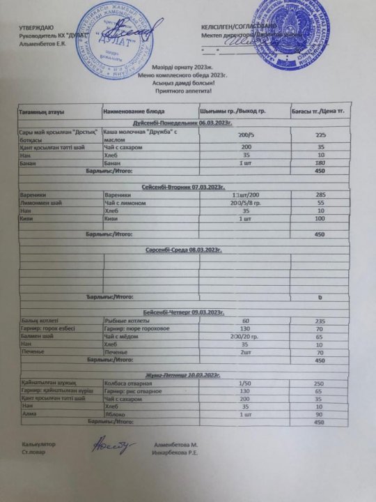 » » Тегін тамақтанатын оқушылардың бір апталық ас мәзірі