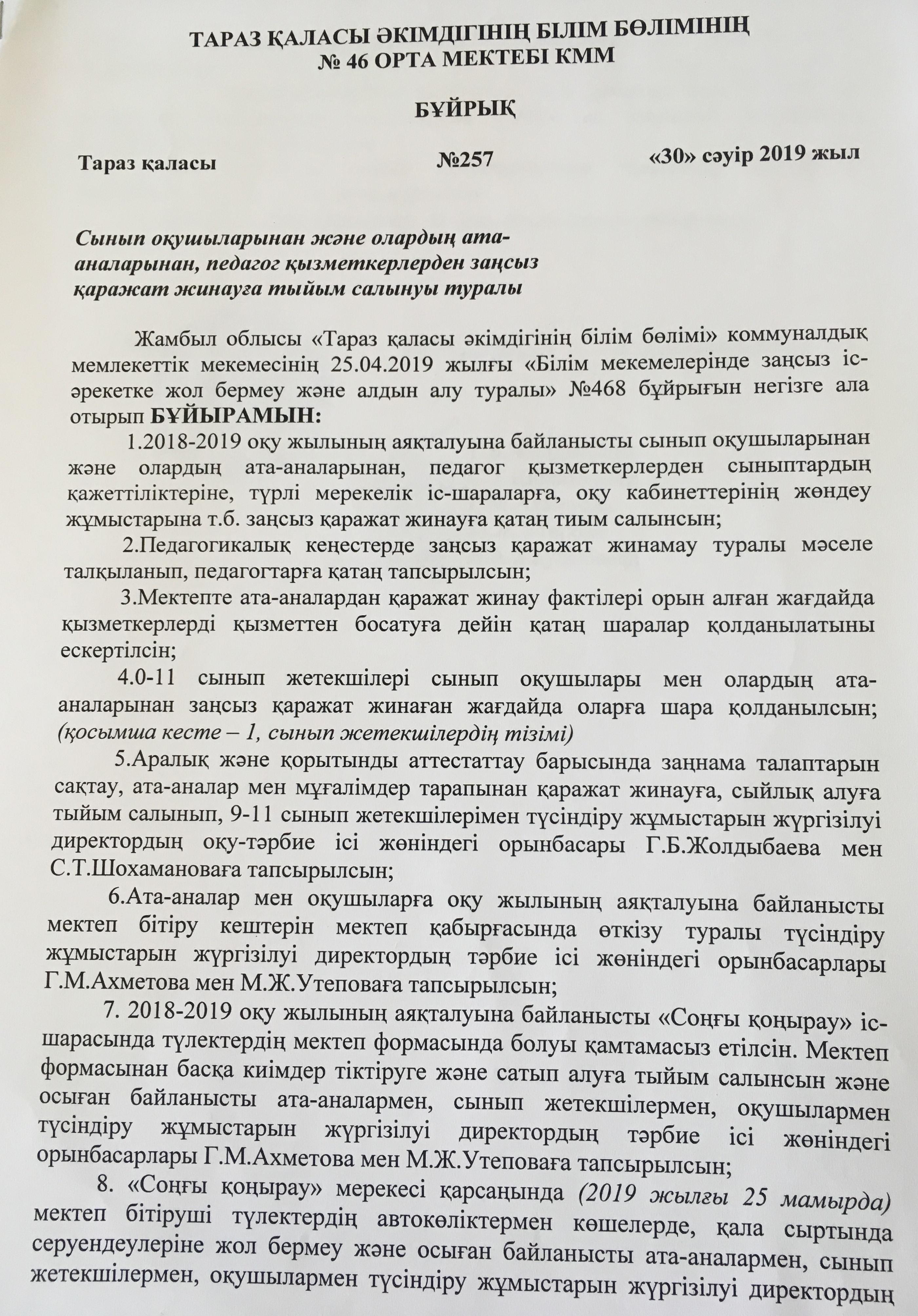 03 мамыр 2019 0 1 2 3 4 5 Оқушылардан және ата-аналардан педагок қызметкерлерден заңсыз қаражат жинауға тиым салу туралы.