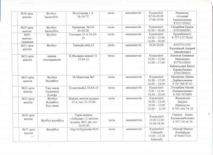 17 маусым 2019 0 1 2 3 4 5 Спорт нысанының тұрғындарға қолжетілімділігі бойынша Білім беру мекемелерінде орналасқан спорт алаңшаларының тұрғындарға қол жетімді болуын қамтамассыз ету мақсатында мектебімізде маусым-тамыз айларына арналған жұмыс кестесі