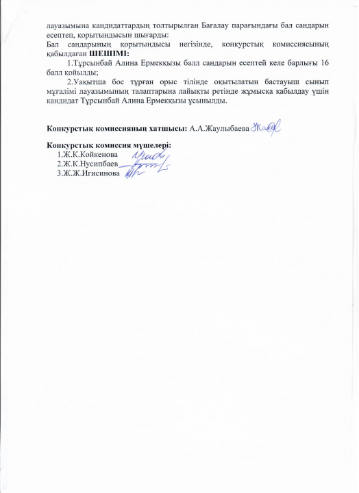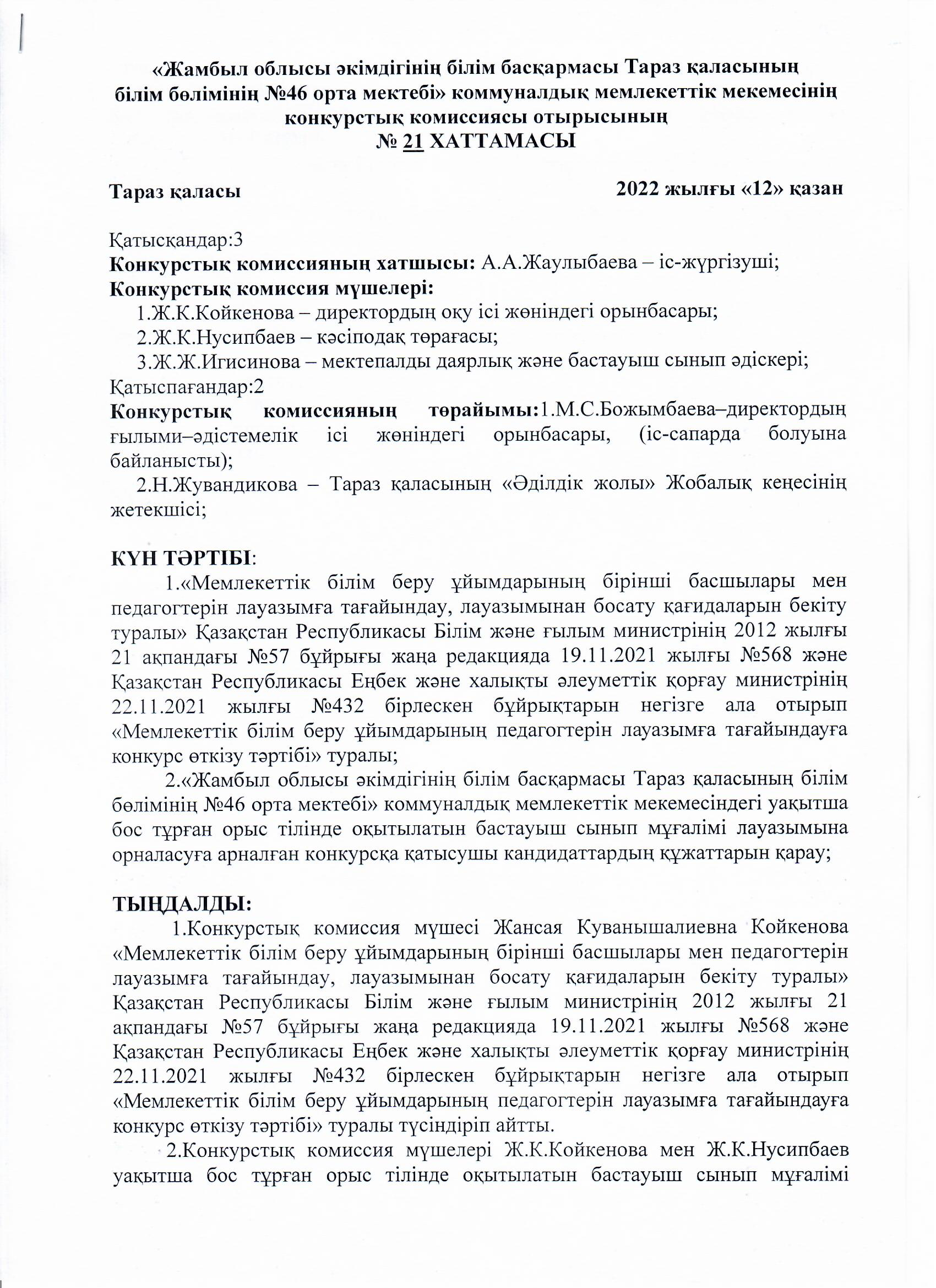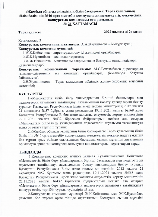 «ЖАМБЫЛ ОБЛЫСЫ ӘКІМДІГІНІҢ БІЛІМ БАСҚАРМАСЫ ТАРАЗ ҚАЛАСЫНЫҢ БІЛІМ БӨЛІМІНІҢ № 46 ОРТА МЕКТЕБІ»коммуналдық мемлекеттік мекемесінің кокурстық комиссиясы отырысының №21 ХАТТАМАСЫ