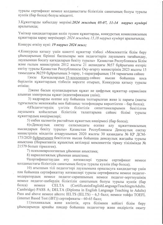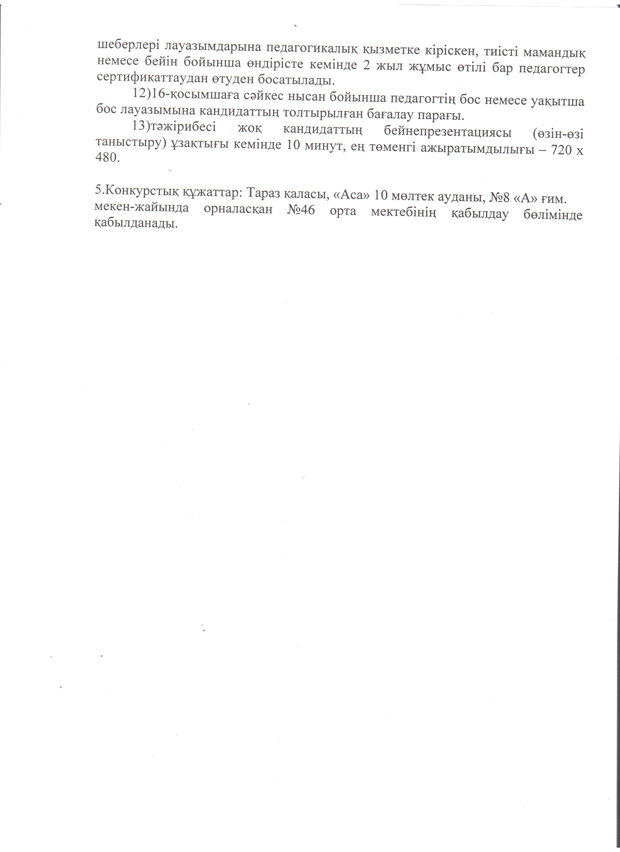 04 наурыз 2024 0 1 2 3 4 5 УАҚЫТША БОС ОРЫНҒА КОНКУРС ЖАРИЯЛАЙДЫ "Жамбыл облысы әкімдігінің білім басқармасы Тараз қаласының білім бөлімінің №46 орта мектебі" КММ-сі уақытша бос орынға конкурс жариялайды