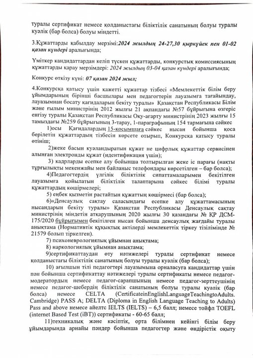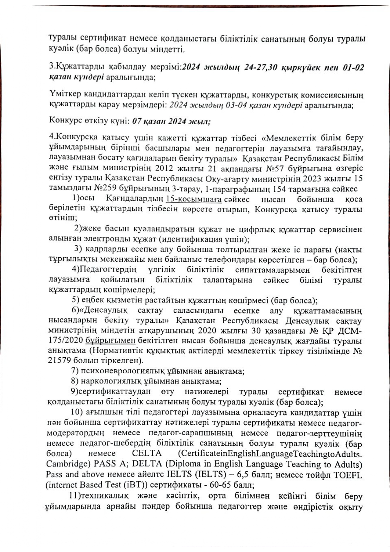 ТҰРАҚТЫ БОС ОРЫНҒА КОНКУРС ЖАРИЯЛАЙДЫ