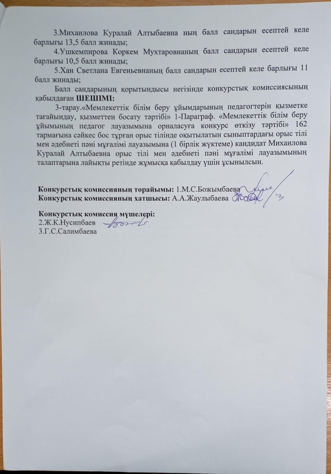 18 қыркүйек 2024 0 1 2 3 4 5 № 19 ХАТТАМАСЫ "Жамбыл облысы әкімдігінің білім басқармасы Тараз қаласының білім бөлімінің 46 орта мектебі" КММ-нің конкурстық комиссия отырысының 19 хаттамасы 18.09.2024 жылғы