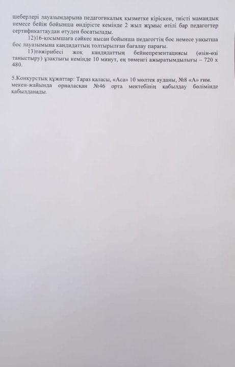11 желтоқсан 2024 0 1 2 3 4 5 Тұрақты бос орынға конкурс жариялайды "Жамбыл облысы әкімдігінің білім басқармасы Тараз қаласының білім бөлімінің 46 орта мектебі" КММ-сі