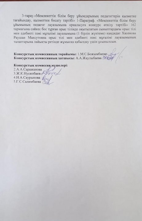 25 желтоқсан 2024 0 1 2 3 4 5 № 29 ХАТТАМАСЫ "Жамбыл облысы әкімдігінің білім басқармасы Тараз қаласының білім бөлімінің 46 орта мектебі" КММ-нің конкурстық комиссия отырысының 29 хаттамасы 25.12.2024 ж.