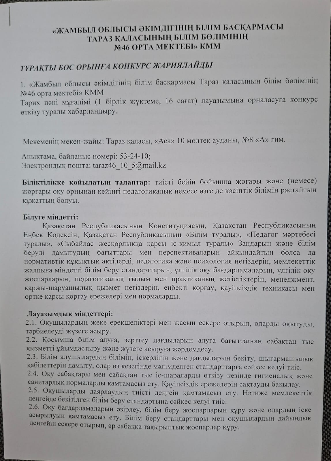 Тұрақты бос орынға конкурс жариялайды » СШ №46