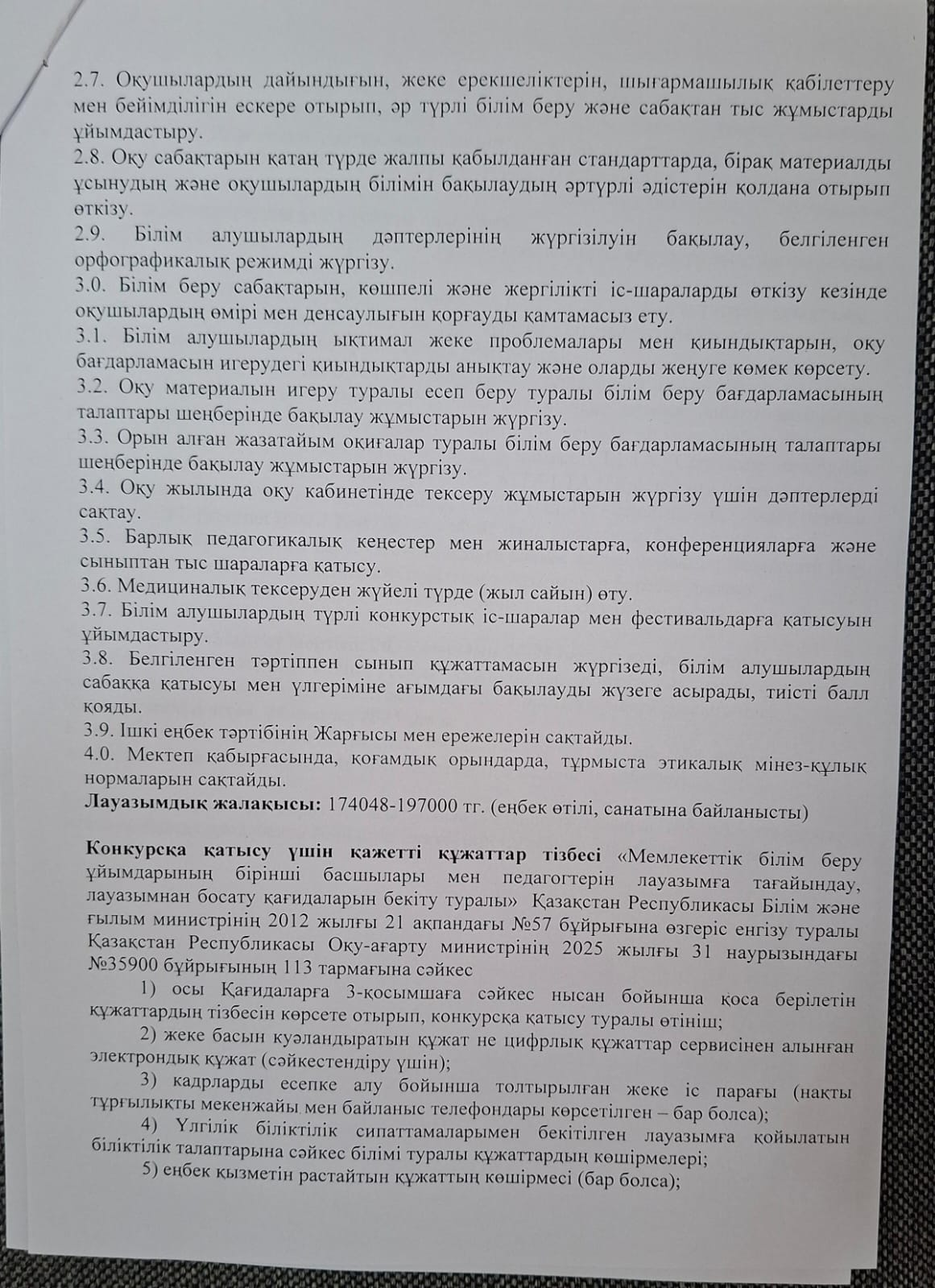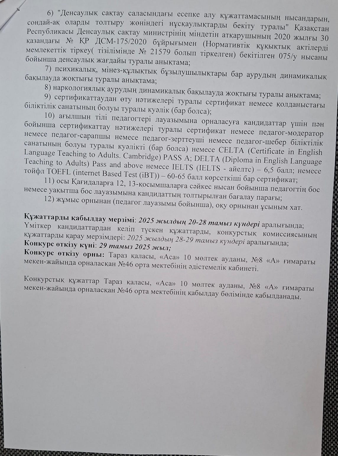 Тұрақты бос орынға конкурс жариялайды