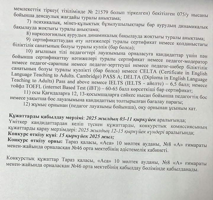 Тұрақты бос орынға конкурс жариялайды