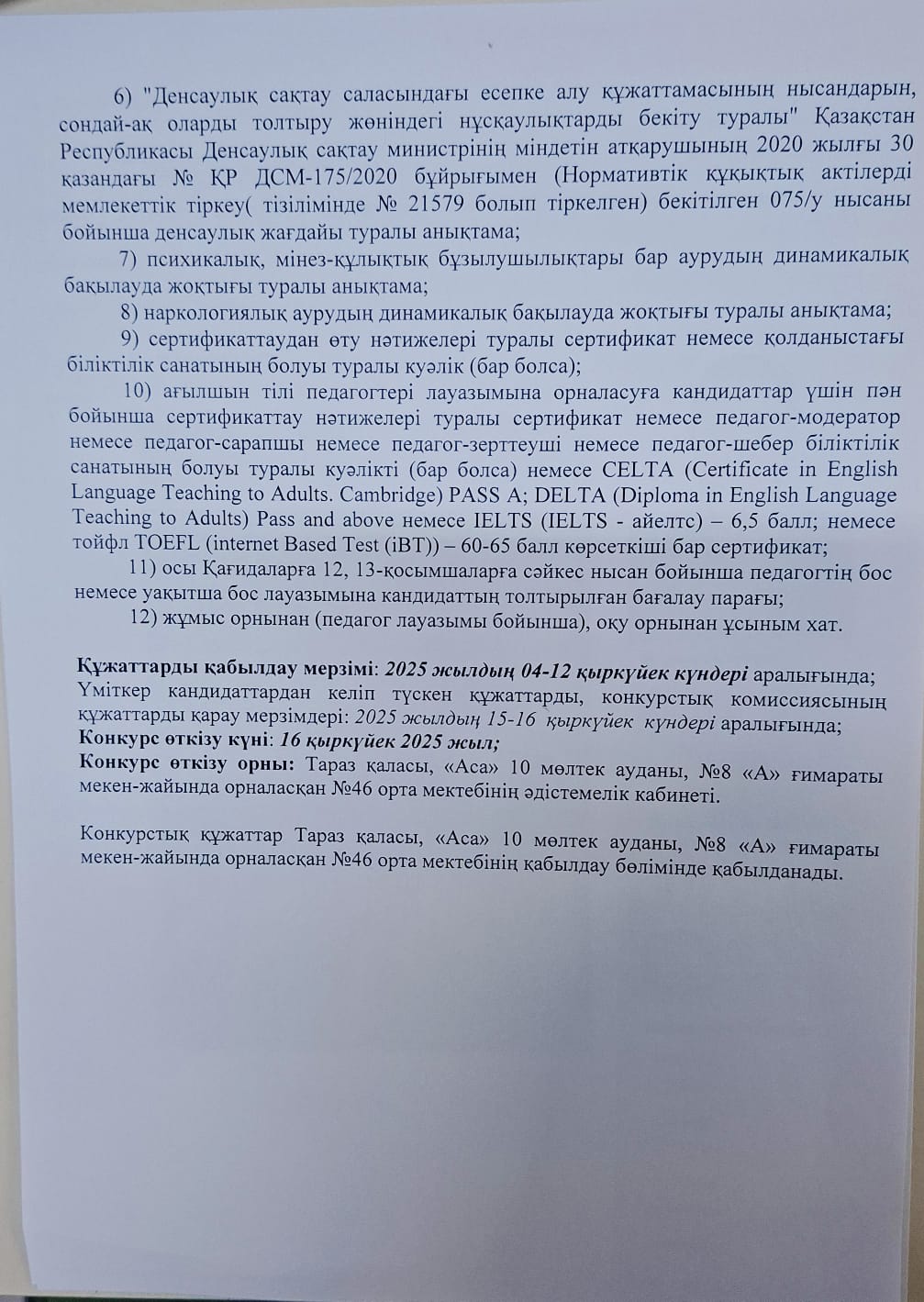 ТҰРАҚТЫ БОС ОРЫНҒА КОНКУРС ЖАРИЯЛАЙДЫ » СШ №46