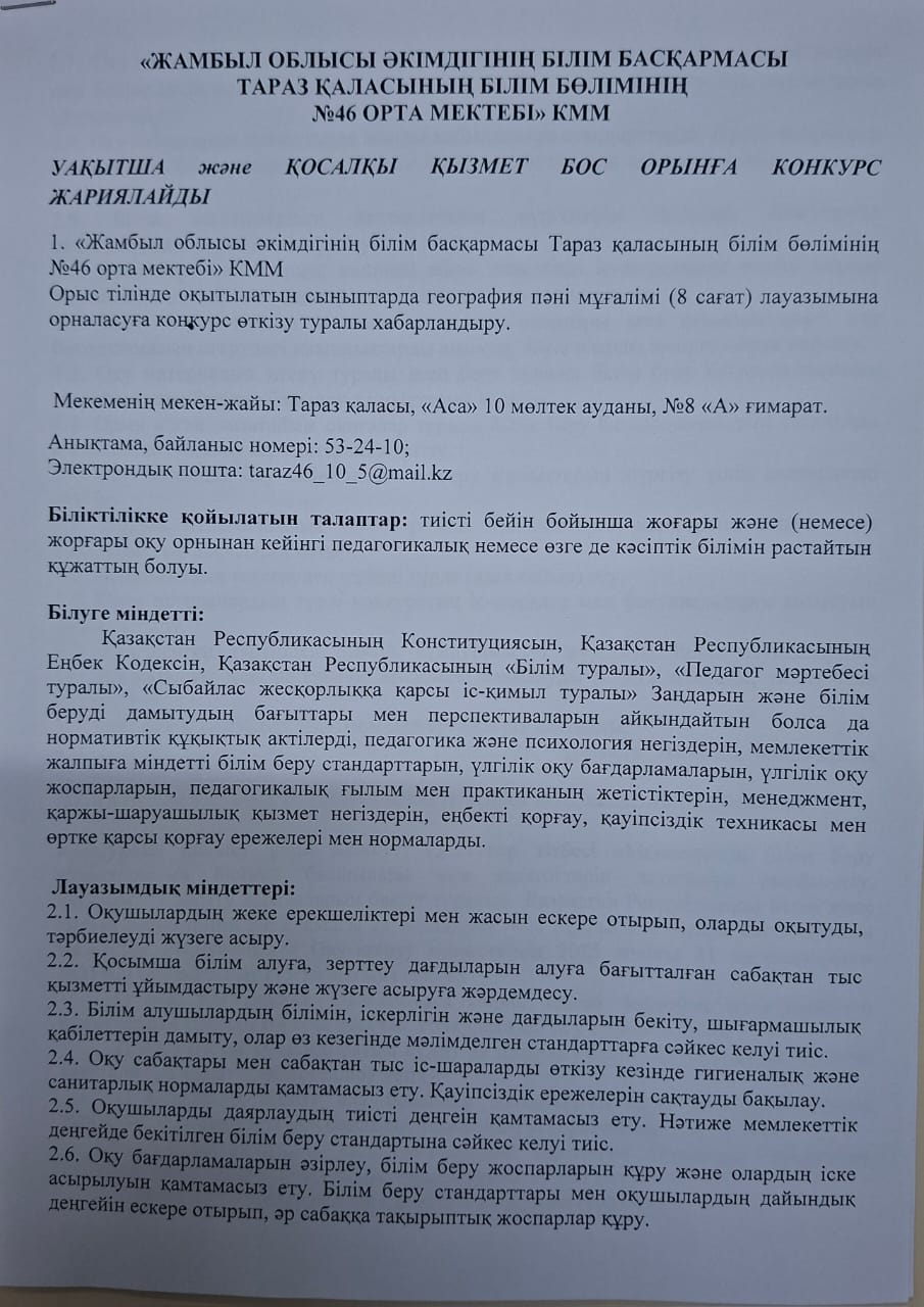 Уақытша және қосалқы қызмет бос орынға конкурс жариялайды » СШ №46