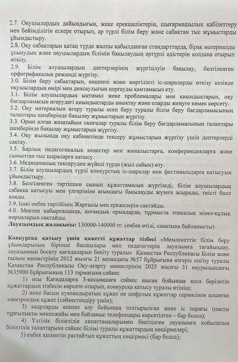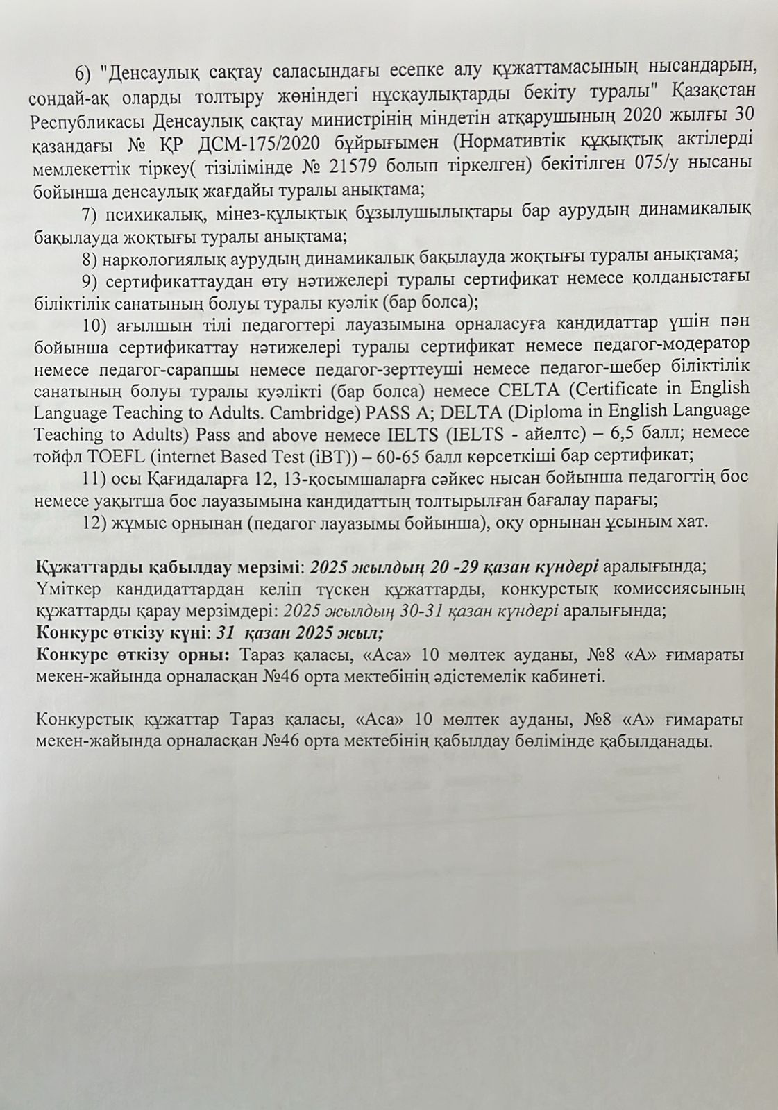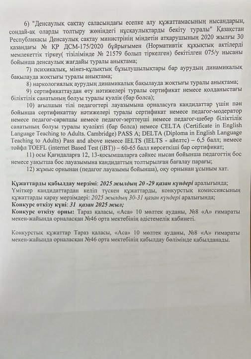 Тұрақты бос орынға конкурс жариялайды » СШ №46