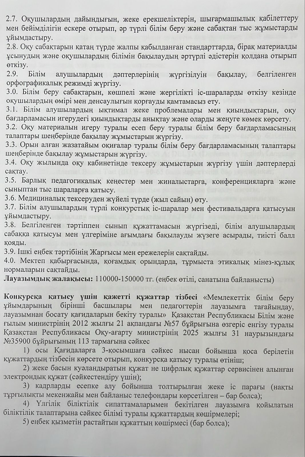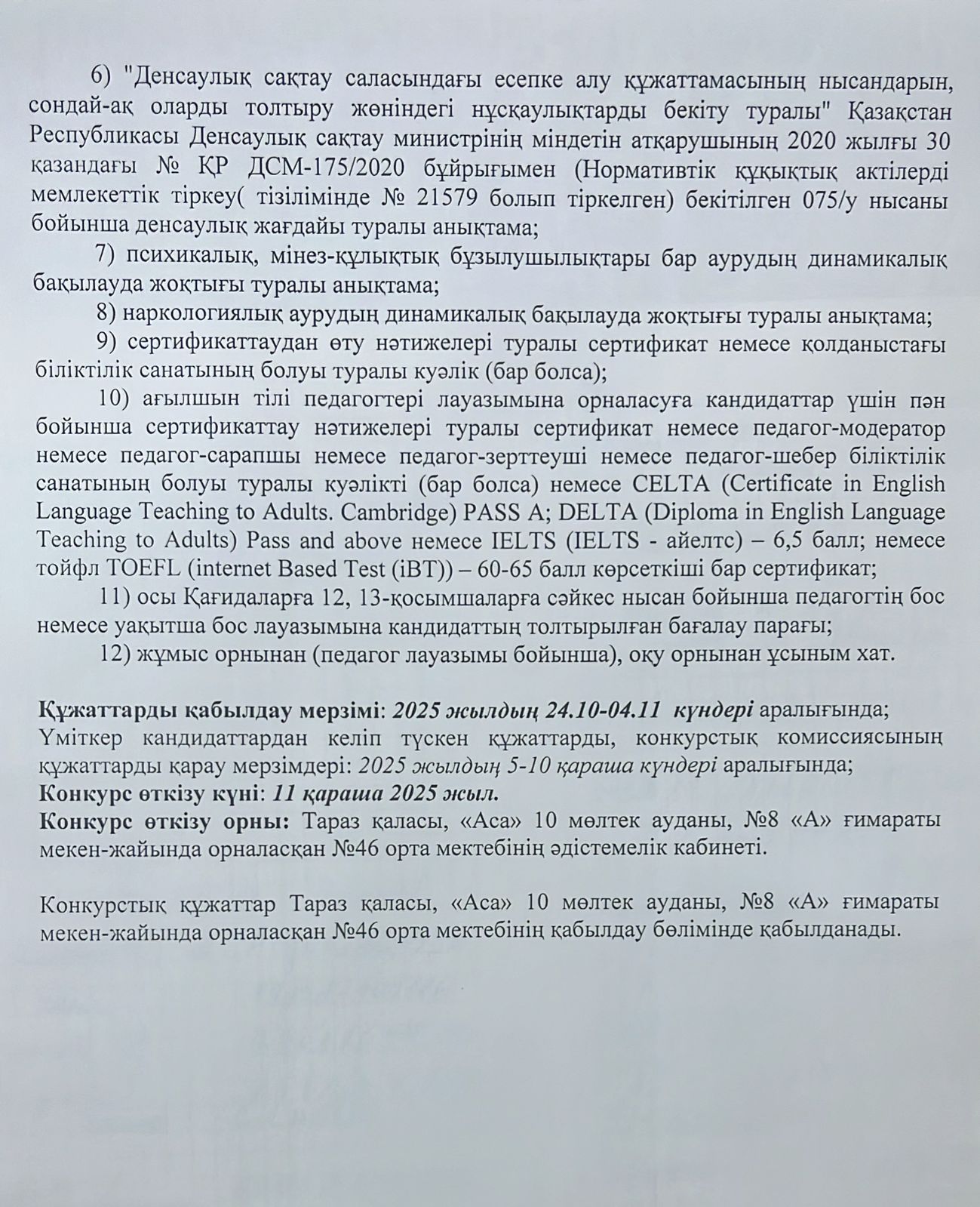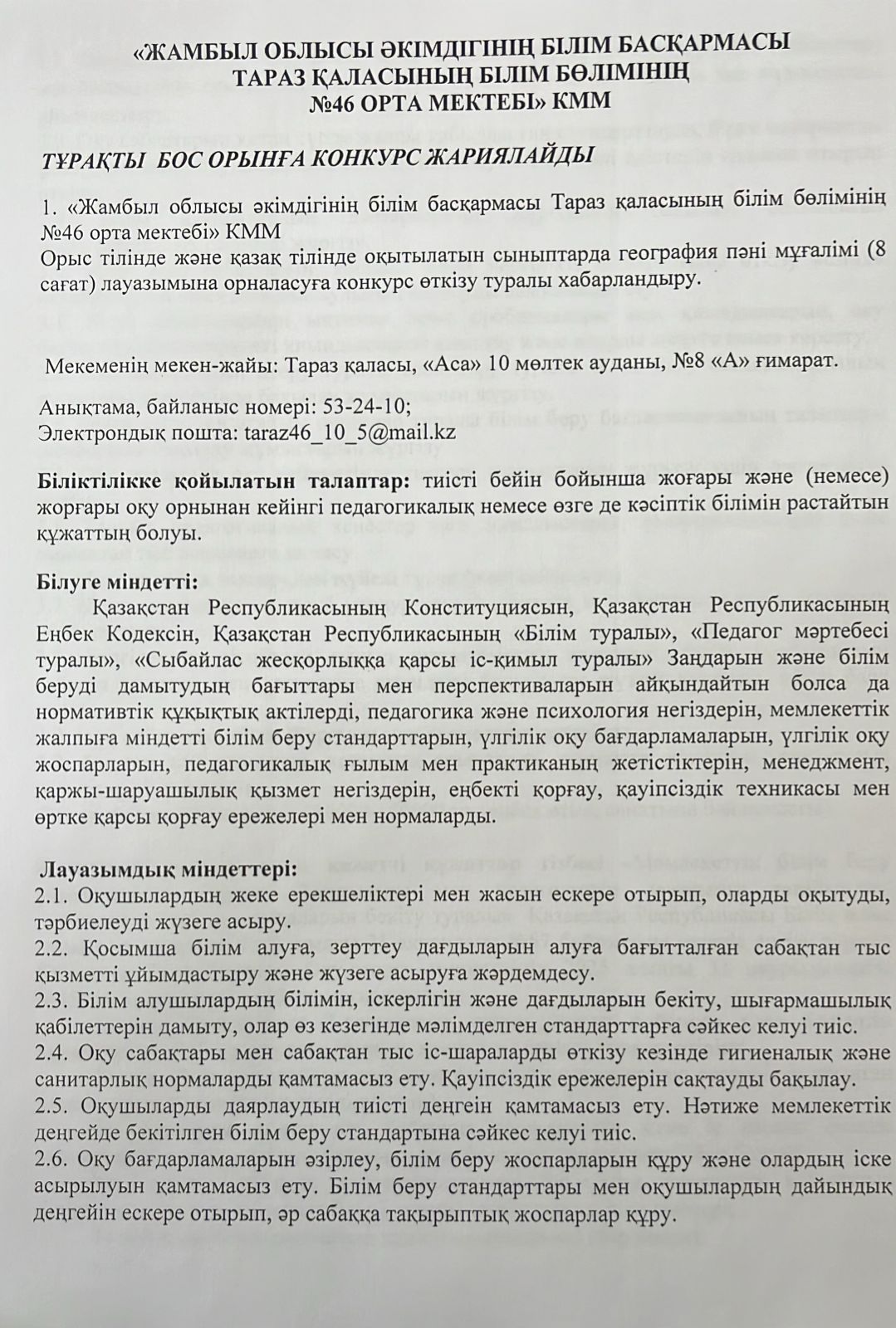 Тұрақты бос орынға конкурс жариялайды » СШ №46