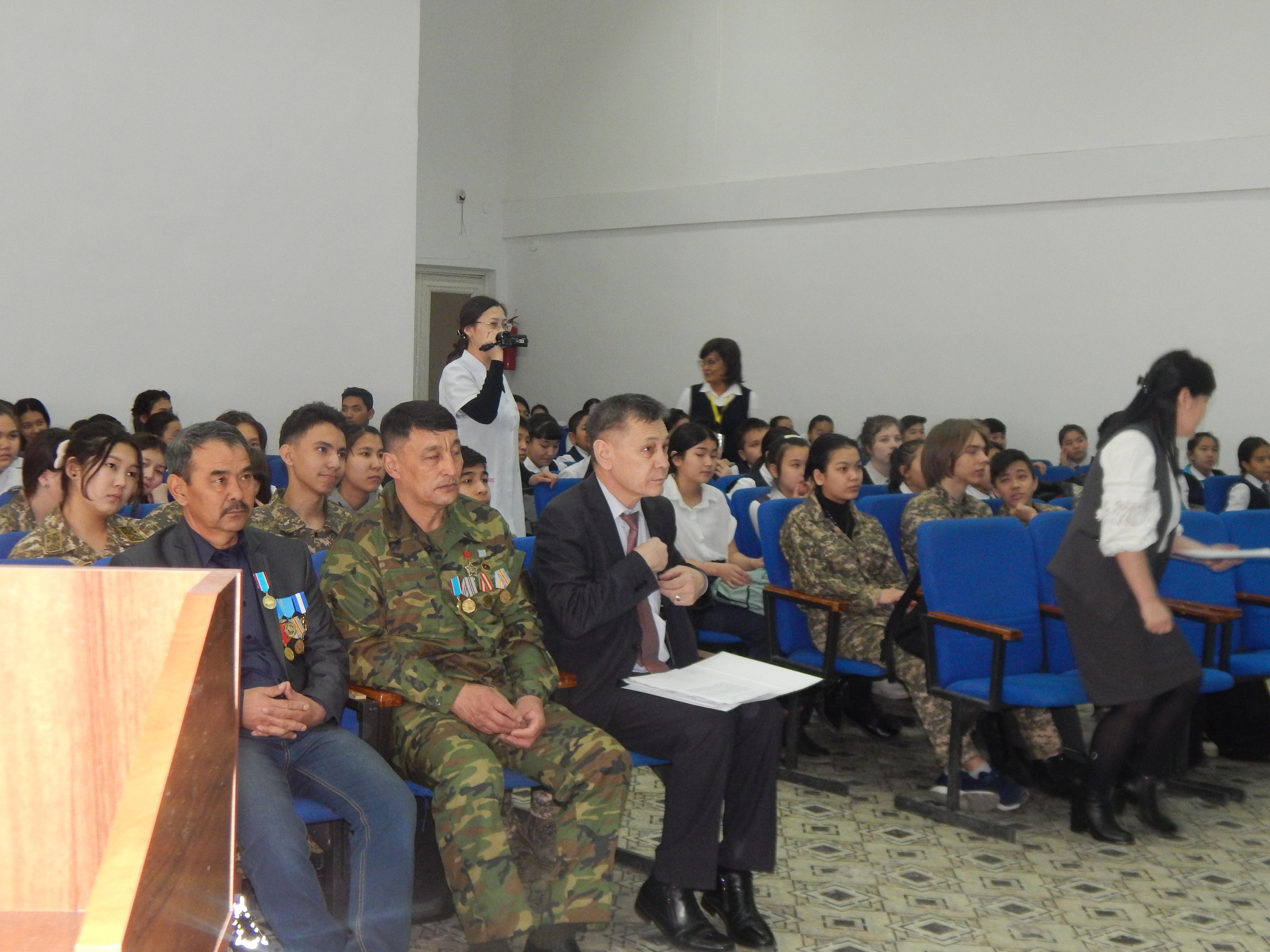 13.02.2020 жылы 6-7 сынып оқушыларымен « Ауғанның отты жалыны » атты мерекелік іс-шара өтті. Мәжіліс залында ұйымдастырылған кеште мектеп басшылығымен ауған соғысына аттанып, аман оралған бүгінгі күннің батыры болған ағаларымыз қонақта болды. Кеште мектебіміздің директоры О.Қ. Шынбергенов ардагерлерге алғыс айтып, жылы тілектерін білдірді. Кешке келген батыр ағалардың отты жылдардан қалған естеліктерін оқушылар зор тебіреніспен тыңдады. Жастарға бейбіт күннің қадірін білуге шақырды. Өткізілген іс-шарада мектеп оқушылары арнайы дайындаған қойылымдарын көрсетті. Кеште 9-сынып оқушысы Дарина қазақша би биледі. 4- сынып оқушысы Диас «Мен қазақпын» атты әнін орындап шықты. Кеште 6-сынып оқушысы Данияр домбырамен күмбірлеген күй орындап кештің шырайын аша түсті. Кештің соңында оқушылар ардагерлермен естелік суретке түсті. Іс-шараның мақсаты: өскелең ұрпақты бейбіт күннің қадіріне жетіп, тәуелсіздікті қастерлейтін азаматтарды өсіру.