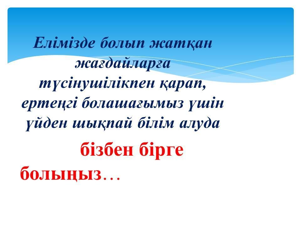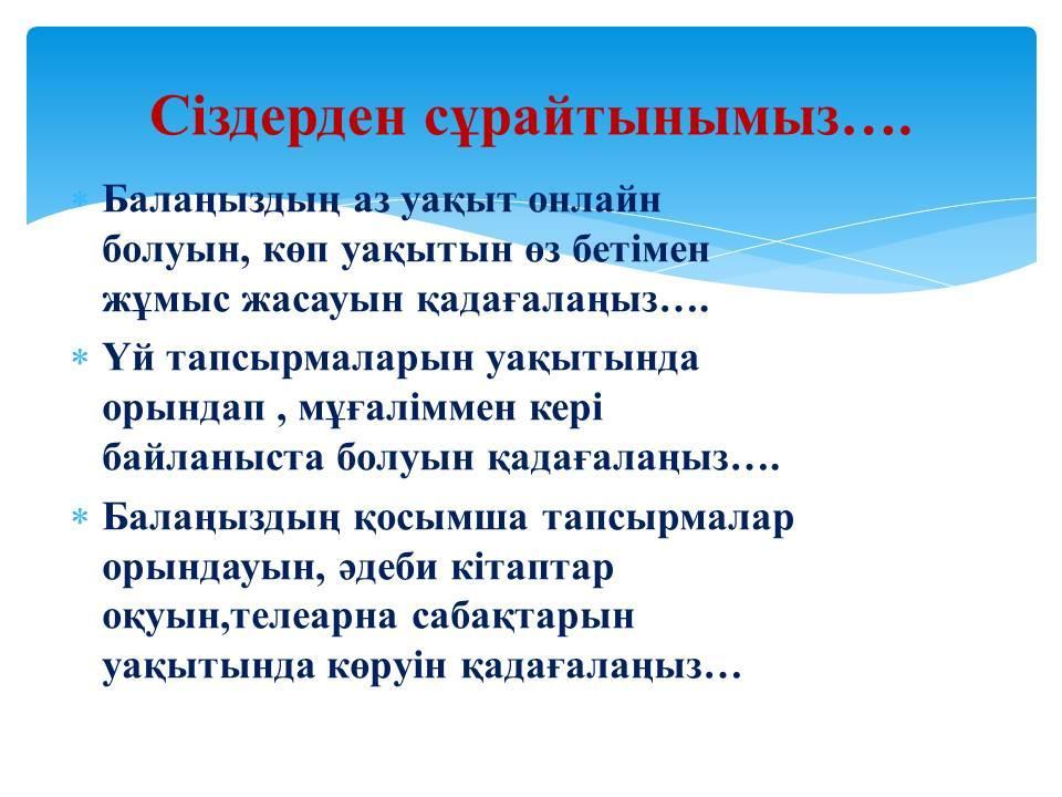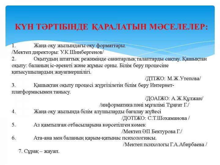 Тақырыбы : «Жаңа оқу жылында балаларды оқыту туралы» Ата-аналар жиналысының мақсаты: коронавирустық инфекцияның таралуына жол бермеуге байланысты карантиндік шаралар жағдайында жаңа 2020-2021 оқу жылындағы оқытудың ерекшеліктері туралы ата-аналарды (балалардың заңды өкілдерін) хабардар ету