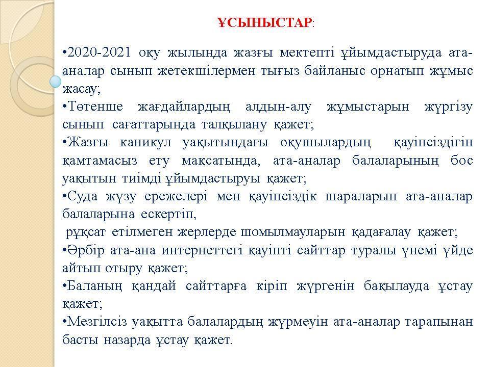 - Жазғы каникул уақытындағы оқушылардың қауіпсіздігін қамтамасыз ету мақсатында ата-аналар балаларының бос уақытын тиімді ұйымдастыруы қажет;
