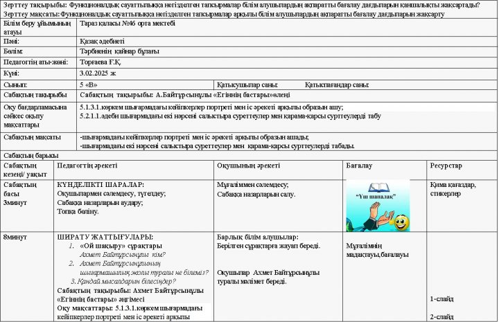 А.Байтұрсынұлы “Егіннің бастары”өлеңі тақырыбындағы авторлық бағдарлама негізінде өтілген ашық сабақ
