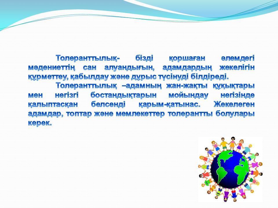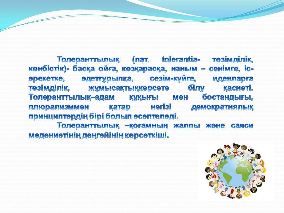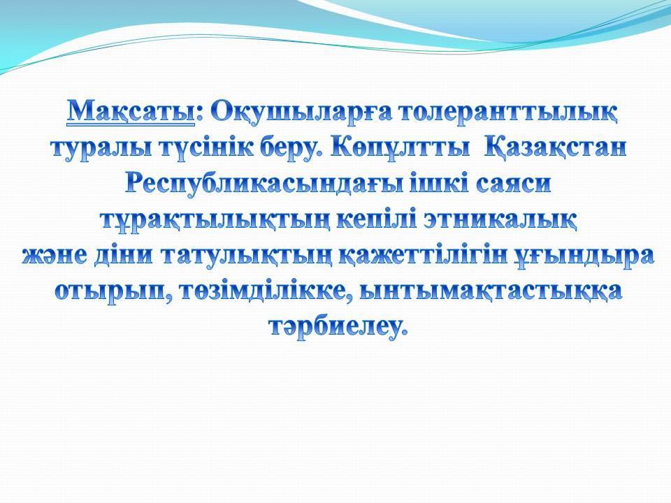 Дөңгелек үстелдің мақсаты: Оқушыларға толеранттылық туралы түсінік беру. Көпұлтты Қазақстан Республикасындағы ішкі саяси тұрақтылықтың кепілі этникалық және діни татулықтың қажеттілігін ұғындыра отырып, төзімділікке, ынтымақтастыққа тәрбиелеу болды.