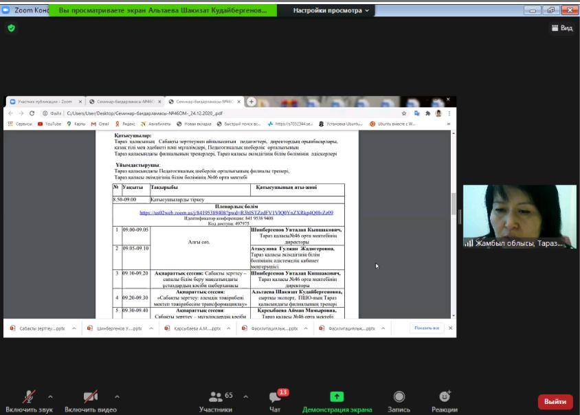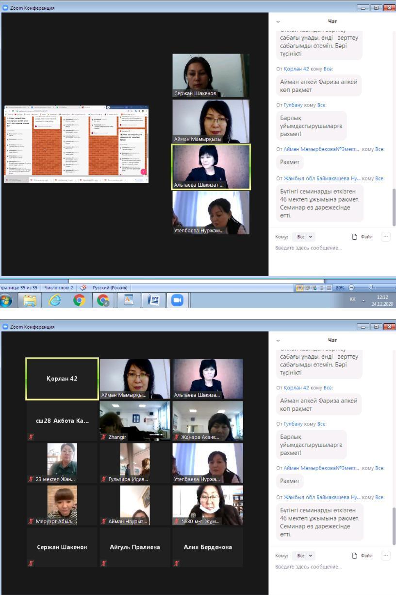 24.12.2020 күні қалалық білім бөлімінің , ПШО Тараз қаласының филиалының қатысуымен №46 орта мектебі Жетекші мектеп ретінде «Сабақты зерттеу – сапалы білім беру мақсатындағы ұстаздардың кәсіби шеберханасы» тақырыбында онлайн семинар өтті.