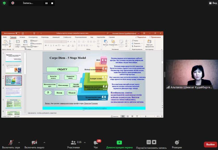 Сабақты зерттеу фокус-топтарының Сабақты зерттеу тәсілін жүзеге асыру нәтижелері бойынша тәжірибе алмасты. Семинарға қатысушылар қашықтан оқыту кезінде Сабақты зерттеуді жүргізудің жолдарын көріп, олардың тарапынан «Семинар жоғары деңгейде өтті» деген баға берілді.