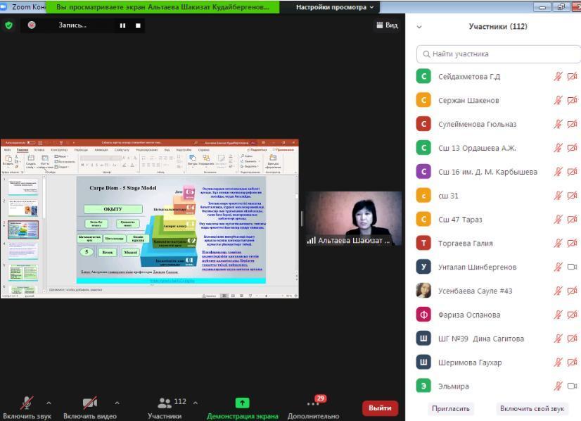 Мақсаты: Қашықтан оқыту жағдайында Сабақты зерттеуді енгізу жобасы аясында мұғалімдердің зерттеу тәжірибесімен бөлісу. Семинарға Тараз қаласының Сабақты зерттеумен айналысатын педагогтері, директордың орынбасарлары, қазақ тілі мен әдебиеті пәні мұғалімдері, Педагогикалық шеберлік орталығының Тараз қаласындағы филиалының тренерлері, Тараз қаласы әкімдігінің білім бөлімінің әдіскерлері қатысты. №46 орта мектептің Сабақты зерттеумен айналысатын педагогтері қашықтан оқыту жағдайында зерттеу сабағын жоспарлау, өткізу, бақылау, талқылау тәжірибесімен бөлісті;