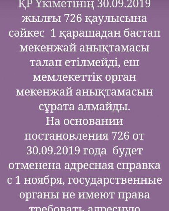 1-қарашадан бастап, мекен жайы анықтамасы талап етілмейді » СШ №46