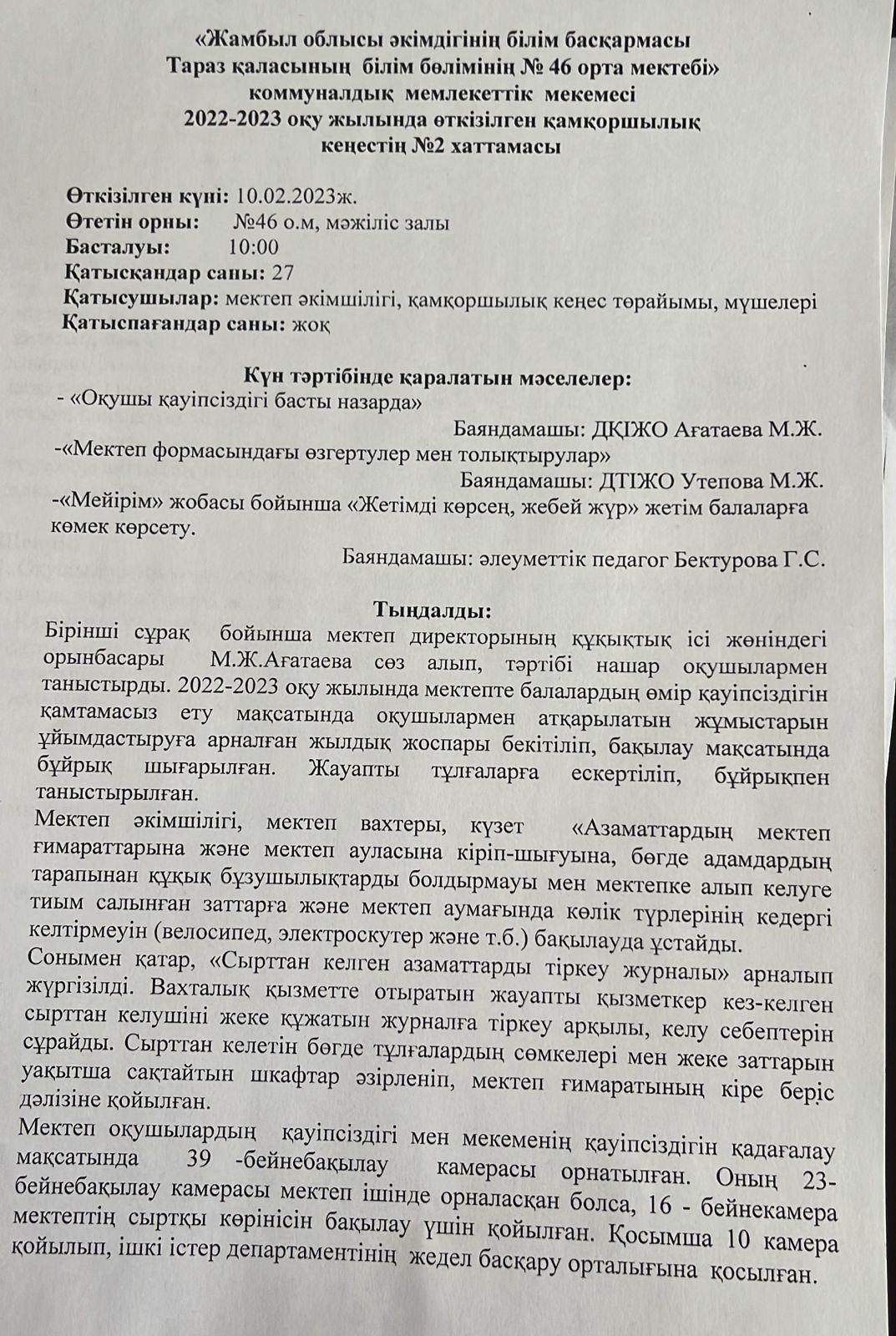 2022-2023 оқу жылында өткізілген қамқоршылық кеңестің №2 хаттамасы » СШ №46